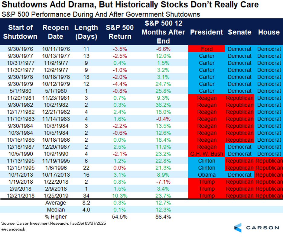What about markets? Historically, shutdowns create headlines and sometimes short-term volatility, but the longer-term market impact has been limited. Across past shutdowns, stocks have often looked through the noise and were frequently higher three to six months later. In fact, back in 2019 during the 34 day shut down, stocks gained more than 10%! That doesn’t mean markets will repeat history exactly, but it’s a helpful reminder that markets tend to focus on fundamentals like growth, earnings, inflation, and interest rates.